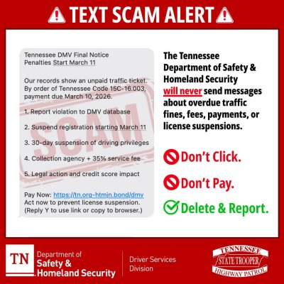 RUTLEDGE – The Tennessee Department of Safety and the Tennessee Highway Patrol are warning residents across the state about a new scam involving fraudulent text… Login to continue reading Login…